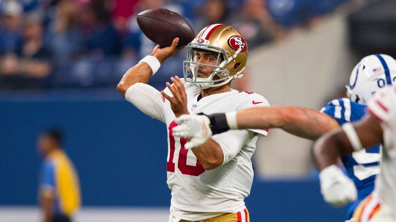 SANTA CLARA, Calif. — Jimmy Garoppolo‘s first preseason as the San Francisco 49ers‘ starting quarterback came to an end Saturday against the Indianapolis Colts. Barring a major surprise, Garoppolo won’t play in the preseason finale Thursday against the Los Angeles Chargers.