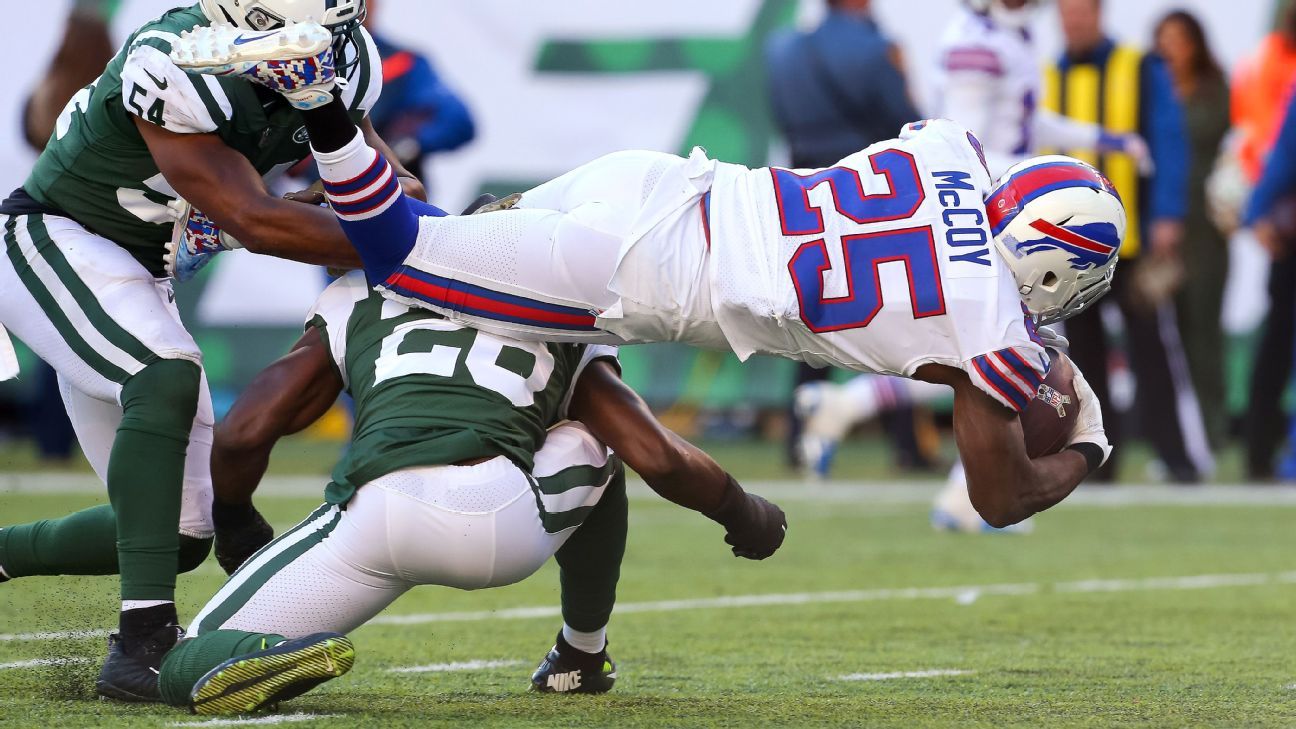 Elusiveness sometimes lacking: Last year, New England Patriots coach Bill Belichick praised McCoy for his ability to “make four guys miss in a phone booth.” Those situations have greeted McCoy frequently this season. However, the instances of McCoy making defenders miss in the backfield, at the line of scrimmage or in the second level of the defense have been less frequent. McCoy spinning away from New York Jets safety Jamal Adams in the backfield for a 23-yard run in Week 10 was one example, but such plays have not come as consistently for McCoy as in the past.